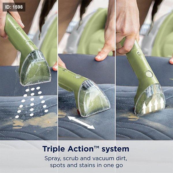 • يتميز نظام التنظيف بثلاث وظائف: رش المنظف، والفرك بفرشاة مدمجة في المقبض، وشفط الأوساخ، كل ذلك في عملية واحدة متكاملة.